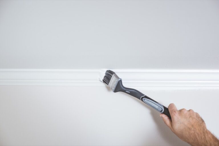 Започнете с корнизите. Използвайте четка. Започнете малко навътре върху корниза и работете към ъглите. Така боята се разпределя по-равномерно. Ако ще боядисвате и стените, може да минете леко извън корниза и надолу по стената.