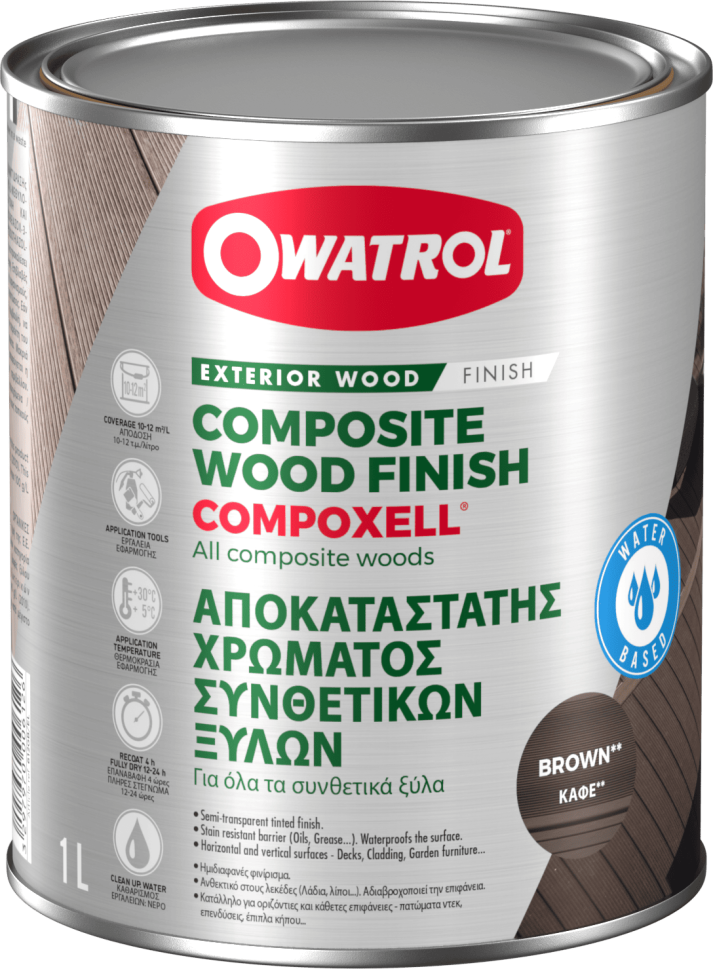 COMPOXELL® BRUN (КАФЯВО) - покритие, предназначено за декорация и обновяване на тераси от композитна дървесина. То предпазва дъските на терасата от UV агресия и атмосферни влияния.