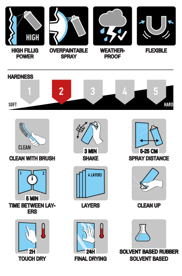 Maston SpraySeal запълва и запечатва течове и пукнатини, осигурявайки гъвкаво водонепроницаемо уплътнение, което предотвратява проникването на влага, ръжда и корозия. Има формула с висока плътност и висок вискозитет, специално разработена за запълване на пукнатини, празнини и отвори, като същевременно поддържа превъзходна гъвкавост дори при температурни промени, фуги от различни материали и UV радиация. Maston SpraySeal съдържа почти три пъти повече твърди вещества в сравнение с конвенционалните продукти. Поради това покритието запечатва бързо и изгражда дебел слой, което ви позволява да напръскате достатъчно материал наведнъж, без да губите време, докато предишният слой изсъхне.