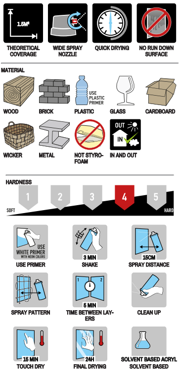Аерозолната боя Maston Metallic с метални пигменти и кратко време за съхнене е акрилна боя за вътрешна и външна употреба. Боята придава перфектно метално покритие на дърво, камък, стъкло, метал и повечето пластмасови повърхности само след едно нанасяне. Инструкции: Грундирайте металните повърхности с грунд за метал, а пластмасовите повърхности с грунд за пластмаса, ако е необходимо. Повърхността трябва да е чиста, суха и без мазнини, восък или силикон. Разклащайте поне 2-3 минути, също така от време на време по време на боядисване. Първо нанесете тестово петно ​​върху невидима зона. Започнете да пръскате извън обекта на разстояние около 15 см от повърхността и движете спрея бавно върху обекта. Първо напръскайте тънък слой, за да подобрите адхезията. Оставете да изсъхне между слоевете за 5 минути. След това нанесете 2-3 тънки кръстосани слоя върху повърхността и оставете да изсъхне. Повторете, ако е необходимо. Съхне на допир 15 минути. Пълно съхне 24 часа. Почистете дюзата, като обърнете флакона с главата надолу и пръскайте, докато излиза само пропелент. Когато използвате продукта на закрито, уверете се, че зоната в радиус от поне 5 метра от боядисания обект е защитена. Прахът от боя е лек и може да се разпространява на големи разстояния чрез вентилация.