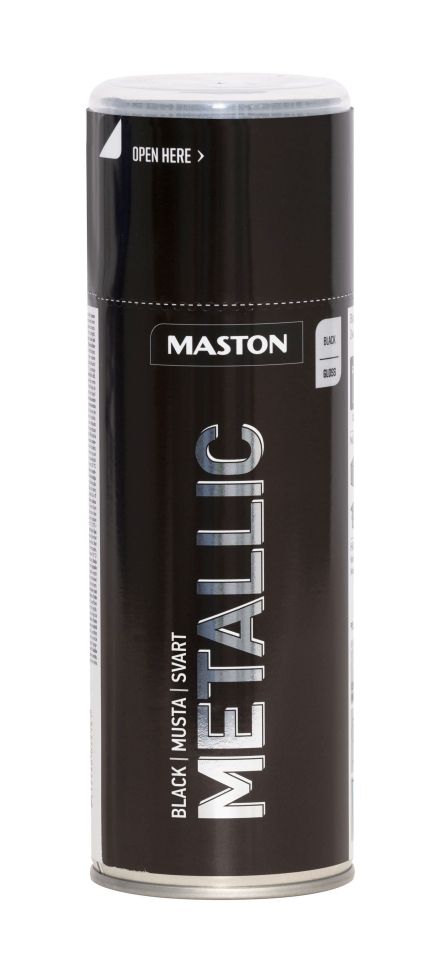 Аерозолната боя Maston Metallic с метални пигменти и кратко време за съхнене е акрилна боя за вътрешна и външна употреба. Боята придава перфектно метално покритие на дърво, камък, стъкло, метал и повечето пластмасови повърхности само след едно нанасяне. Инструкции: Грундирайте металните повърхности с грунд за метал, а пластмасовите повърхности с грунд за пластмаса, ако е необходимо. Повърхността трябва да е чиста, суха и без мазнини, восък или силикон. Разклащайте поне 2-3 минути, също така от време на време по време на боядисване. Първо нанесете тестово петно ​​върху невидима зона. Започнете да пръскате извън обекта на разстояние около 15 см от повърхността и движете спрея бавно върху обекта. Първо напръскайте тънък слой, за да подобрите адхезията. Оставете да изсъхне между слоевете за 5 минути. След това нанесете 2-3 тънки кръстосани слоя върху повърхността и оставете да изсъхне. Повторете, ако е необходимо. Съхне на допир 15 минути. Пълно съхне 24 часа. Почистете дюзата, като обърнете флакона с главата надолу и пръскайте, докато излиза само пропелент. Когато използвате продукта на закрито, уверете се, че зоната в радиус от поне 5 метра от боядисания обект е защитена. Прахът от боя е лек и може да се разпространява на големи разстояния чрез вентилация
