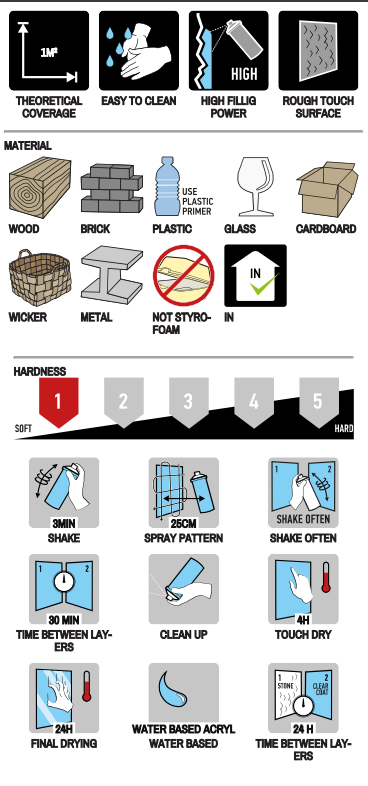 Спрей MASTON STONE EFFECT придава вида и усещането за естествен камък на всяка повърхност. Тази уникална формула дава текстурирано, многоцветно покритие. Тя ще трансформира обикновените предмети в красив каменен ефект. Използвайте акрилен грунд. Само за вътрешна употреба. Повърхността има ограничена устойчивост на износване. За по-добра защита, покрийте с акрилен лак Maston. Не се препоръчва повторно нанасяне на други бои.