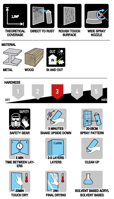 Универсалната метална боя Maston Hammer е подходяща за всички метални повърхности, с изключение на поцинкована стомана, както на закрито, така и на открито. Всичко в едно: защита от ръжда, грунд и повърхностна боя. Препоръчва се премахването на излишната ръжда преди нанасяне, което осигурява по-добра издръжливост. За алуминиеви, неръждаеми, месингови и медни повърхности препоръчваме грундиране с киселинен грунд Maston 1K. Време за съхнене: сухо на допир: 30 мин., сухо: 24 ч. Пребоядисайте, ако е необходимо, след 15 мин. (+20°C) само със самата боя Maston Hammer. Когато използвате продукта на закрито, уверете се, че зоната в радиус от поне 5 метра от боядисания обект е защитена. Прахът от боя е лек и може да се разпространи на големи разстояния чрез вентилация.