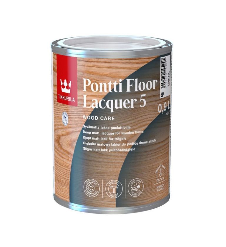 Pontti Floor Lacquer 5 е акрилатен лак на водна основа, който осигурява полупрозрачно, напълно матово покритие на вътрешни дървени подове, стълби и прагове.