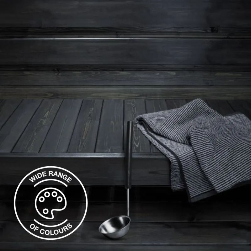 Покритието за сауна може да се тонира според цветовите карти Pro grey, Interior Wood Stains and Lacquers и Valtti.