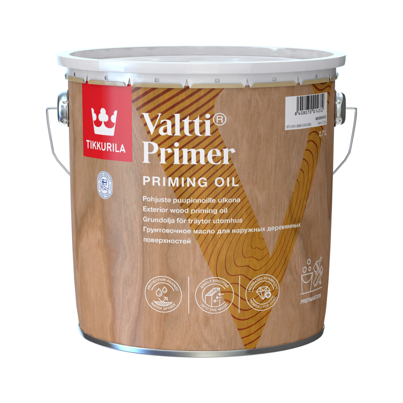 Valtti Primer е традиционен безцветен грунд. Основата се абсорбира в дървесината, правейки необработената дървесина водоотблъскваща и осигурявайки защита срещу микробни атаки и атаки от насекоми. Грундът Valtti може да се покрива с широка гама от масла и непрозрачни горни покрития Tikkurila и е идеално решение за обработка на греди от ламел и други дървени материали, които могат да се съхраняват на открито преди монтажа.